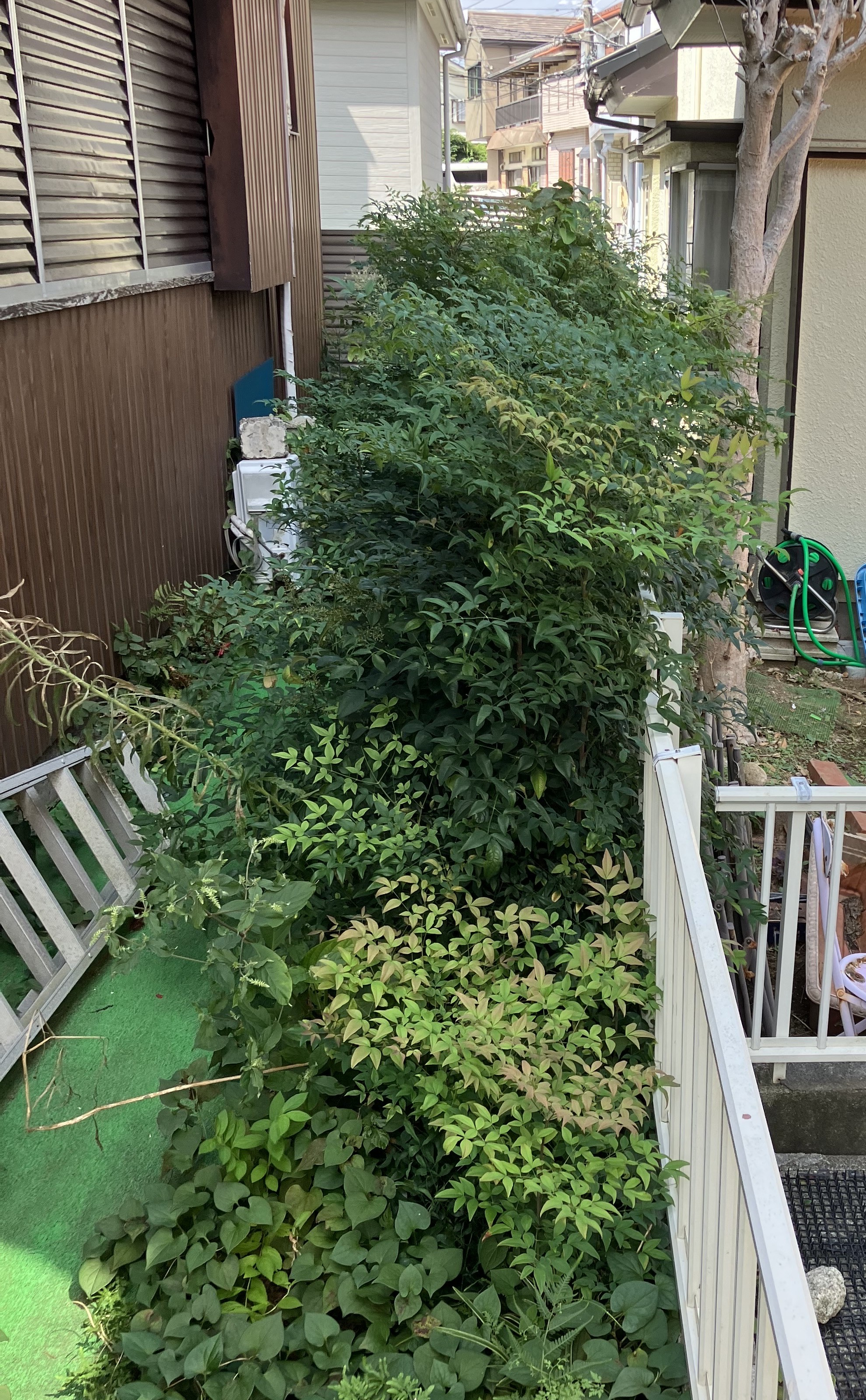 | 担当者のコメント | 昨年、大掛かりに除草、剪定、伐採を行いました。 1年経ち、今回は生垣剪定と隣家に越境した枝葉を剪定しました。生垣は中が見えずらい程度に剪定し、道路に伸びた枝木を切り取りました。 |
